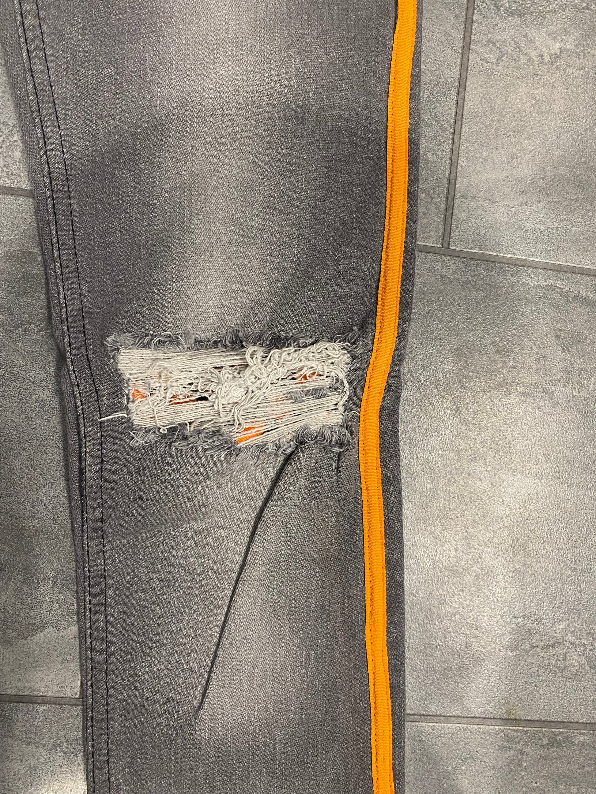 Description: Grey slim fit jeans, orange and black chequered pattern.
